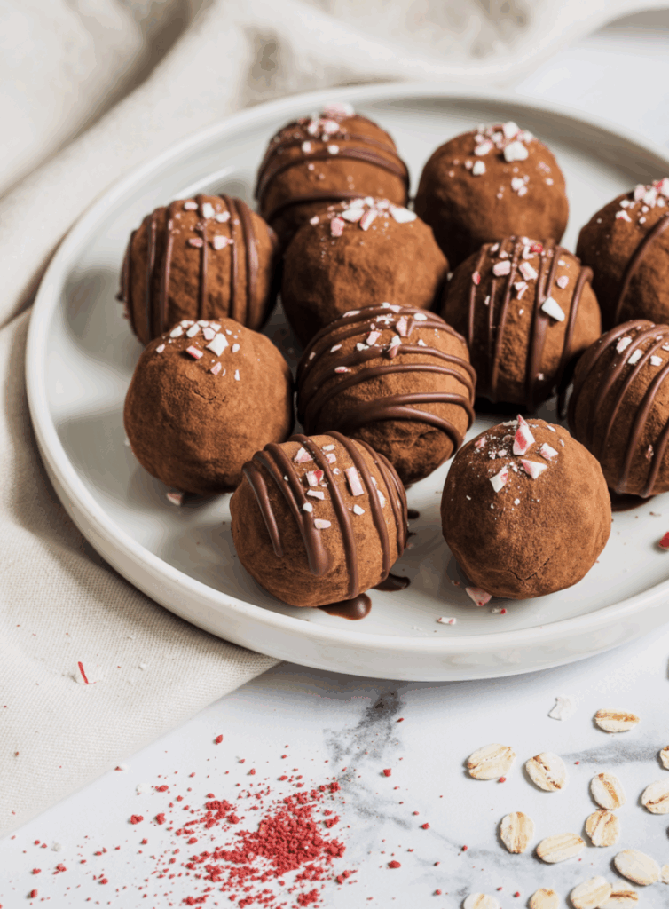 - Scoop the mixture and roll it between your palms to form small balls. Coat them in cocoa powder for a classic finish or press a few crushed candy cane pieces on top for a festive look. Place them in the fridge for at least 30 minutes to firm up before serving.
