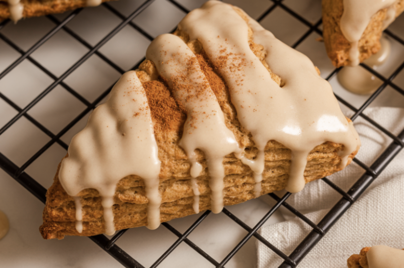 - While the scones cool, whisk together the powdered sugar, maple syrup, milk, and chai spice until smooth and pourable, then drizzle it generously over the scones and let it set for a few minutes before serving.