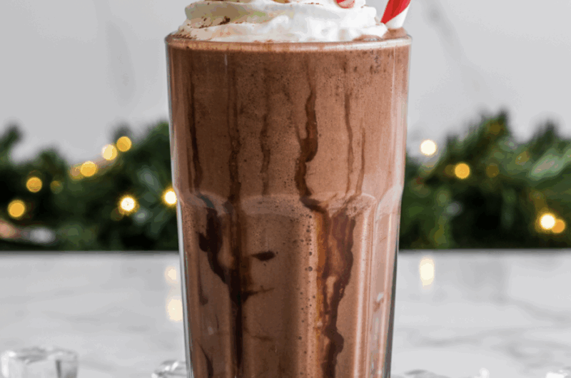 - Step 2: Pour the shake into a tall glass and top it with whipped cream. Sprinkle some crushed candy cane and a dusting of cocoa powder on top. Serve with a red-and-white straw or a candy cane hooked on the rim to get that full Christmas-movie moment.