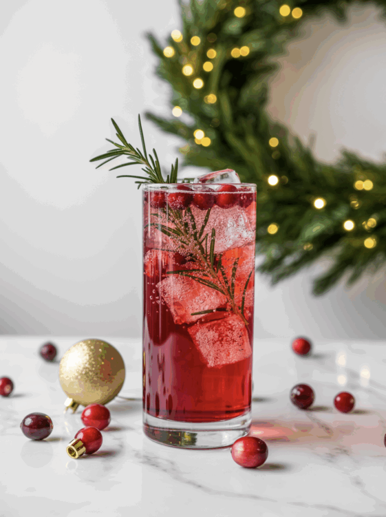 Pour cranberry juice into a glass, top with sparkling water, and garnish with cranberries and rosemary. Serve chilled.