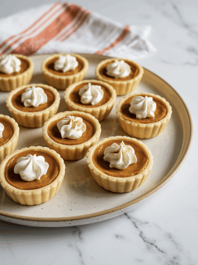 - Spoon the mixture evenly into each crust, filling almost to the top. Bake for 22–25 minutes, or until the centers are set and slightly puffed. Let them cool completely before removing from the tin. Top with whipped cream and a sprinkle of cinnamon before serving.