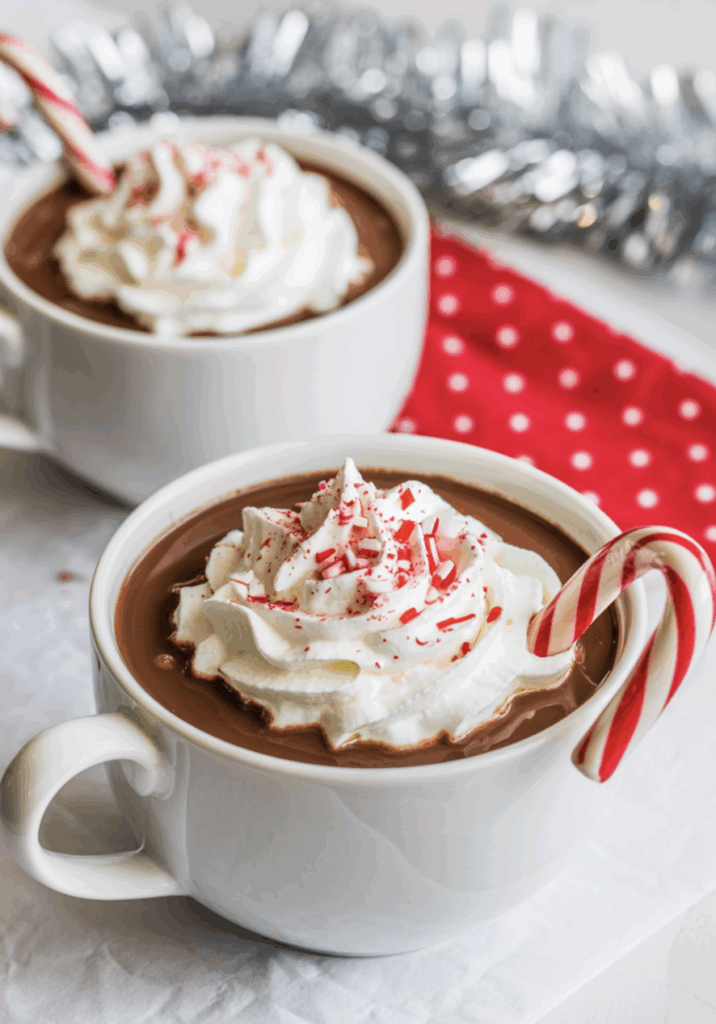 Warm milk in a saucepan, whisk in cocoa and maple syrup, and stir until smooth. Add peppermint extract. Pour into mugs and top with coconut whipped cream and candy cane pieces.